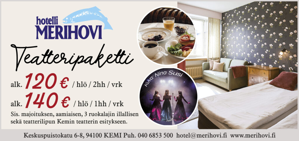 Mobiilimaksutavoilla voi maksaa ainoastaan Kemin Teatterin lippukassalla teatteritalon ala-aulassa, Sauvosaarenkatu 4.